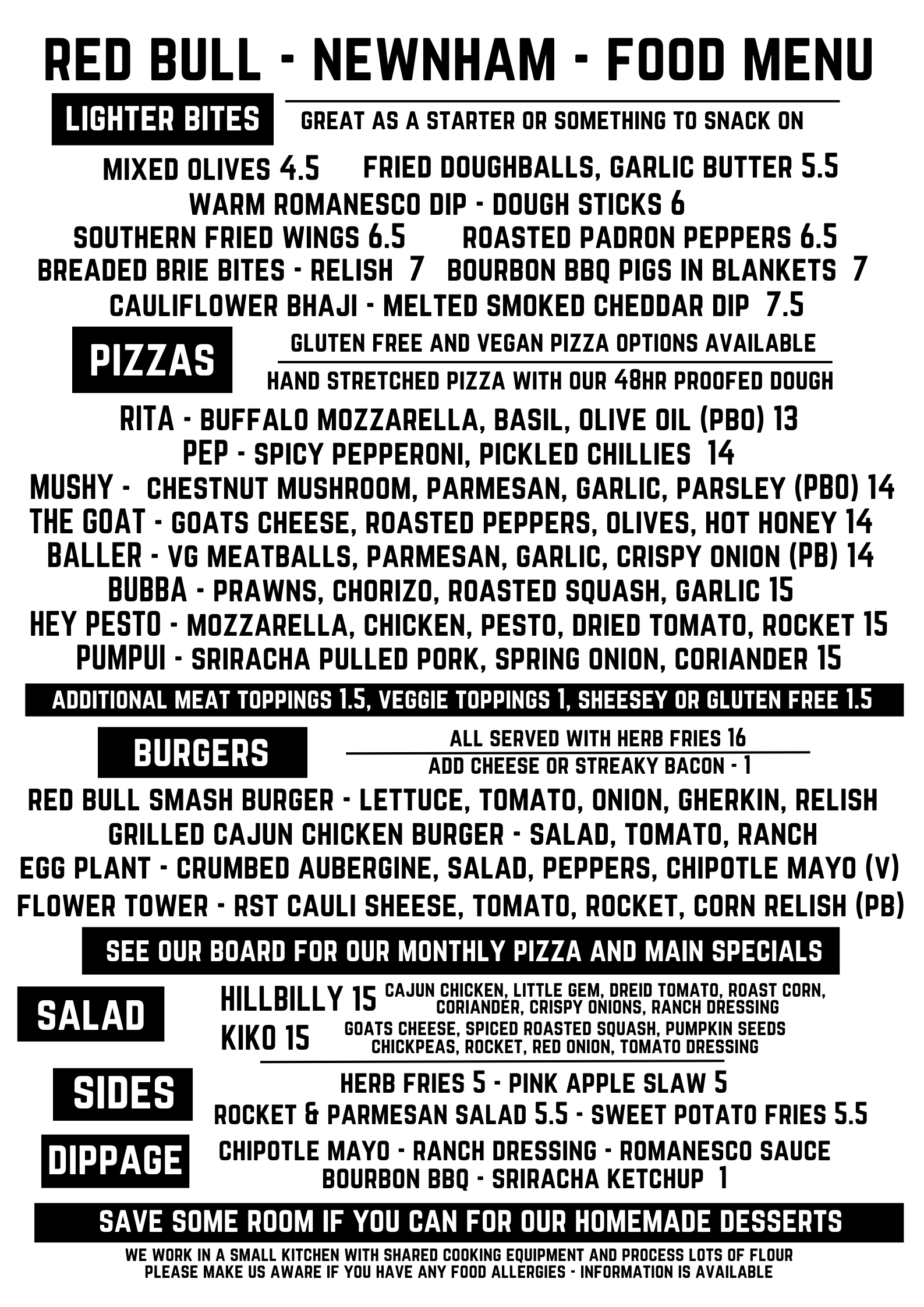 SEE OUR BOARD FOR OUR MONTHLY PIZZA AND MAIN SPECIALS.
